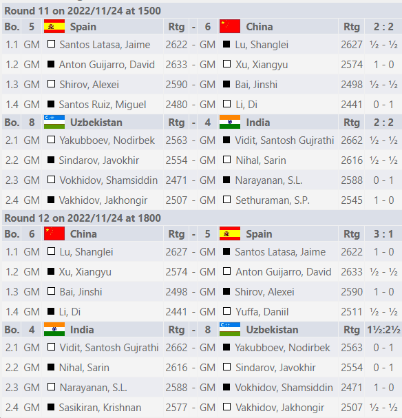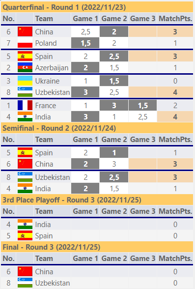 Сборная Украины выбыла из турнира днем ранее в четвертьфинале. 23 ноября в 1/4 финала Украина проиграла оба мини-матча команде Узбекистана, победителю шахматной Олимпиады 2022.