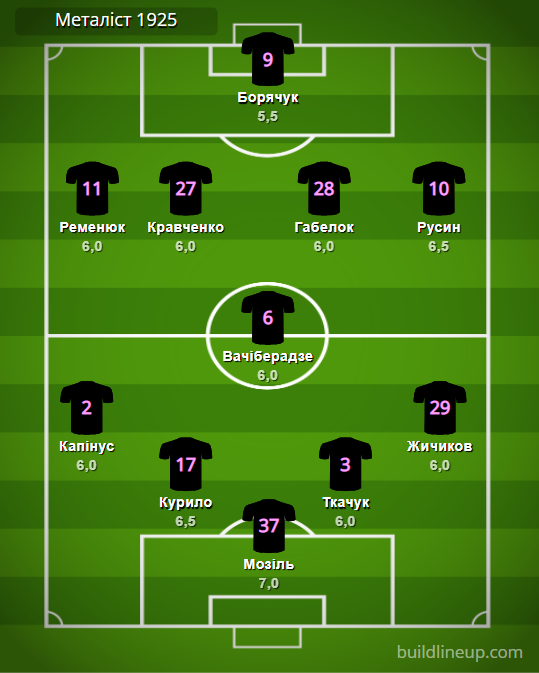 «Металлист 1925»: Мозиль – Капинус, Курило, Ткачук, Жичиков – Вачиберадзе (Мартынюк, 57) – Ременюк, Кравченко (Шершень, 83), Габелок, Русин – Борячук (Чирук, 76).