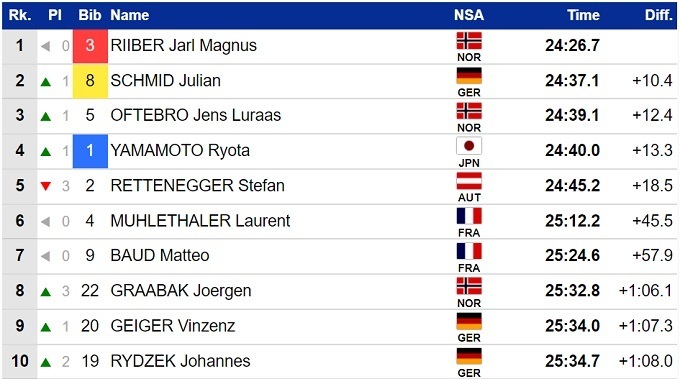Вторым стал вчерашний победитель, немец Юлиан Шмид. Это позволило ему сохранить лидерство в общем зачете Кубка мира.