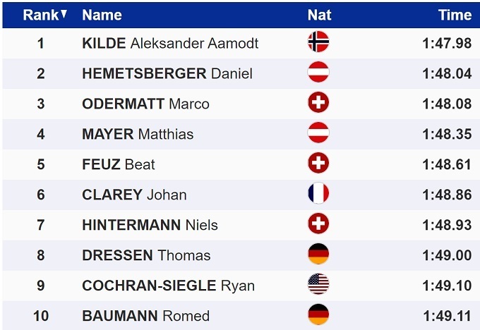 Действующий обладатель Кубка мира, швейцарец Марко Одерматт, замкнул топ-3. Именитый итальянец Доминик Парис сошел с дистанции из-за того, что у него отстегнулась лыжа во время заезда.