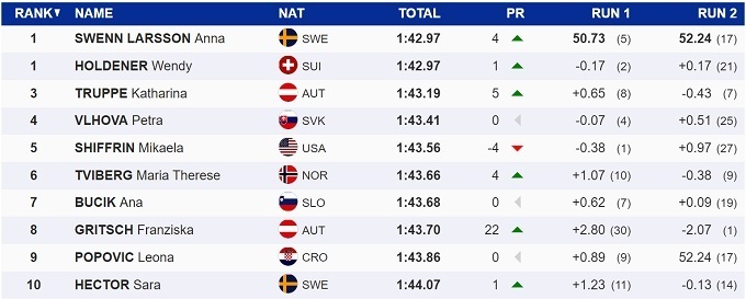 Для Свенн-Ларссон это первая в карьере победа на Кубке мира, а для Холденер – первая в слаломе. Микаэла Шиффрин лидировала после первой попытки, но финишировала только пятой.