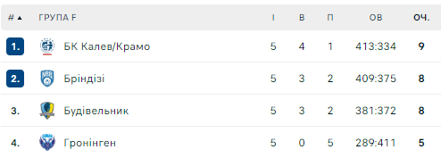 «Будивельник» делит 2–3 места по набранным очкам (3 победы, 2 поражения). Во второй этап выйдут две лучшие команды группы.
