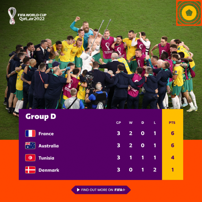 В группе D цели достигли: Франция (6 очков) и Австралия (6), оставив позади Тунис (4) и Данию (1).