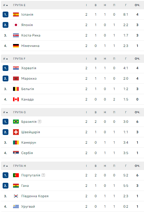 Турнирные таблицы ЧМ-2022. Определено 10 из 16 участников плей-офф