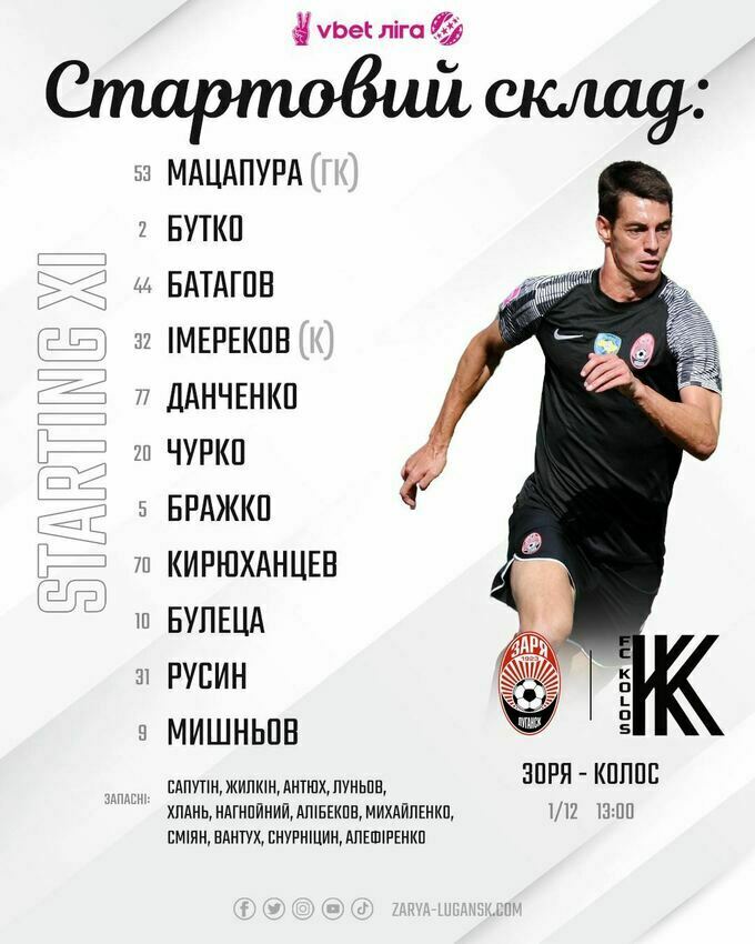 Стали известны составы луганской «Зари» и «Колоса» из Ковалевки на отложенный поединок 7-го тура Украинской Премьер-лиги. Встреча начнется в 13:00 по киевскому времени на столичном стадионе «Динамо» имени Лобановского.