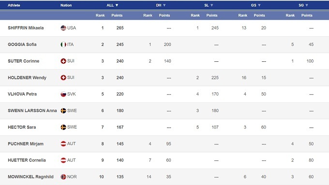 А победу в супергиганте одержала Коринн Сутер, которая до этого дважды поднялась на подиум в скоростном спуске. Блестящий уик-энд для швейцарки, которая за три дня набрала суммарно всего на 5 очков меньше, чем Годжа, и также врывается в число претенденток на БХГ. И это при том, что в скоростных видах в нынешнем сезоне состоялось всего три старта, а в технических четыре: по темпу набора очков и Годжа, и Сутер пока что впереди Шиффрин и компании.