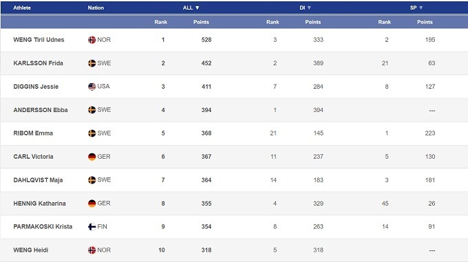 Это сказалось, прежде всего, на воскресном масс-старте: до финиша практически одной группой добрались сразу 16 спортсменок. Свою вторую победу в сезоне одержала Фрида Карлссон, которая снова начинает постепенно теснить на вторые роли свою партнершу по команде Эббу Андерссон. А вот в пятничной коньковой разделке на вторых ролях оказались обе шведских звезды: Андерссон стала четвертой, а Карлссон – вообще восьмой. Фрида жаловалась на боли в бедре и субботний спринт пропускала.