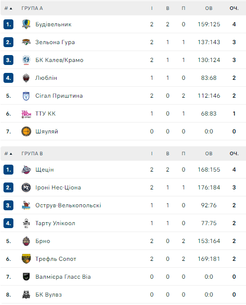 Турнирная таблица ENBL. Будивельник одержал две победы на старте турнира