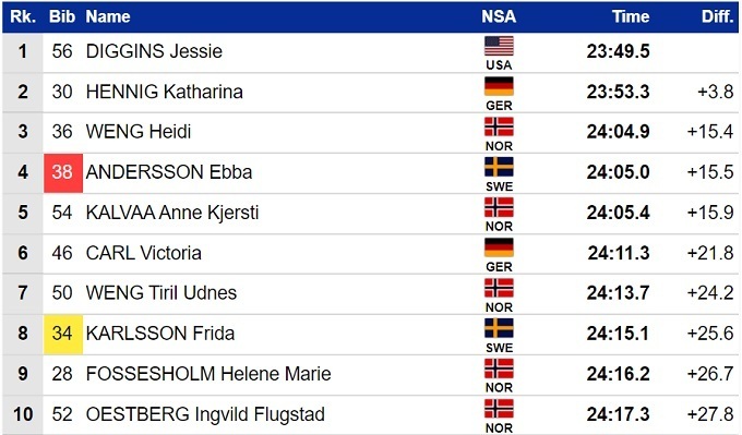 Компанию на подиуме Диггинс составили немка Катарина Хенниг и норвежка Хейди Венг. Звездные шведки, Эбба Андерссон и Фрида Карлссон, заняли лишь четвертое и восьмое места соответственно. Тириль Венг стала седьмой и перехватила у Карлссон желтую майку лидера общего зачета.