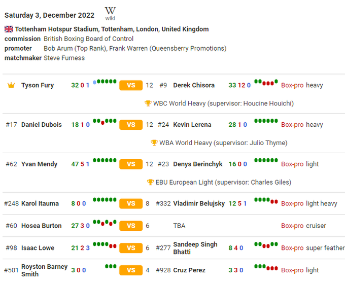 Самым главным боем шоу в Лондоне будет мегафайт супертяжей-британцев за пояс WBC: Тайсон Фьюри (32–0–1, 23 КО) против Дерека Чисоры (33–12, 23 КО).