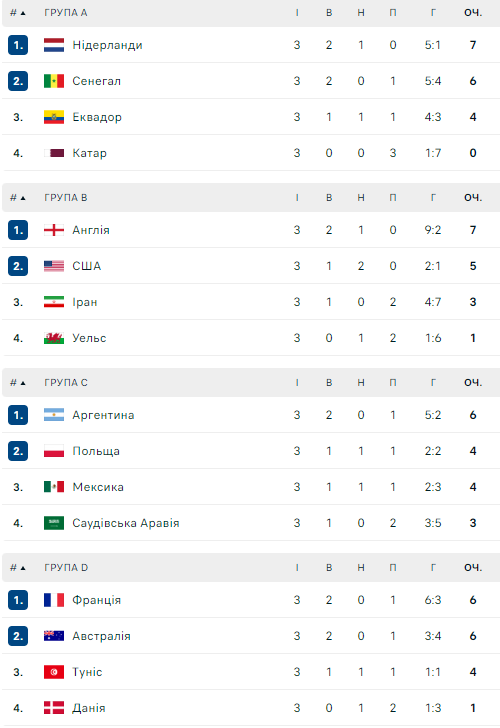 На стадии 1/8 финала Нидерланды сыграют против США, а Англия встретится с Сенегалом. Аргентина будет играть против Австралии, а Франция разыграет путевку в четвертьфинал с Польшей. Эти матчи состоятся 3 и 4 декабря.