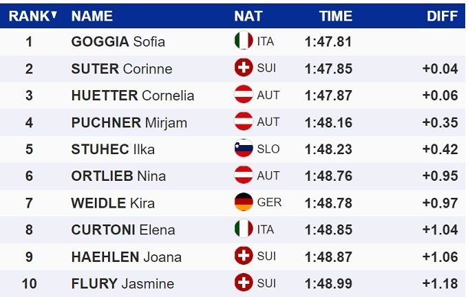 Сегодня, 2декабря в канадском Лейк Луисе состоялся первый скоростной спуск в нынешнем сезоне женского Кубка мира. Победу одержала звездная итальянка Софья Годжа. Компанию на подиуме ей составили швейцарка Коринн Сутер и австрийка Корнелия Хюттер, которые проиграли всего 0,04 и 0,06 секунд соответственно.
