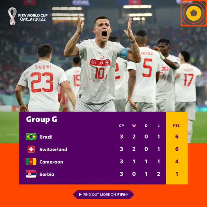 Из группы G в плей-офф вышли: Бразилия (6 очков) и Швейцария (6), опередив Камерун (4) и Сербию (1).