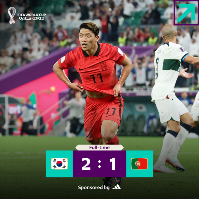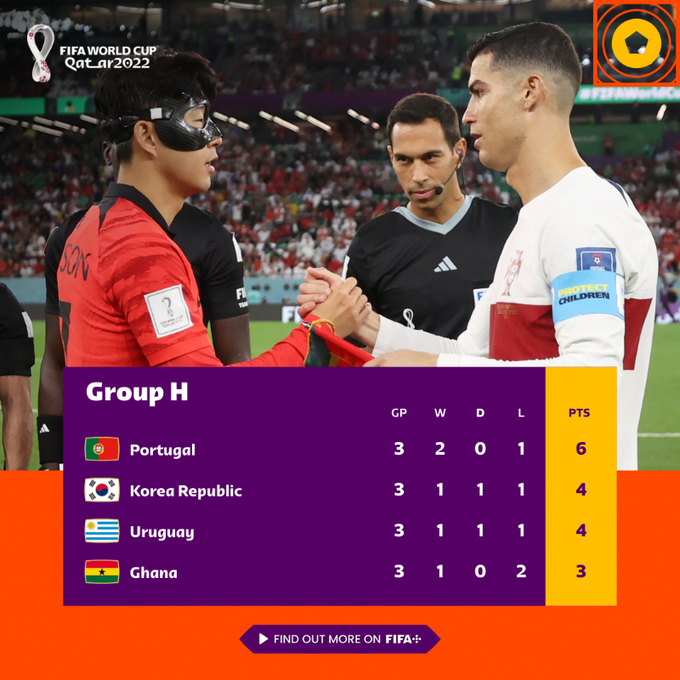 В группе H цели достигли: Португалия (6 очков) и Южная Корея (4), оставив позади Уругвай (4) и Гану (3).