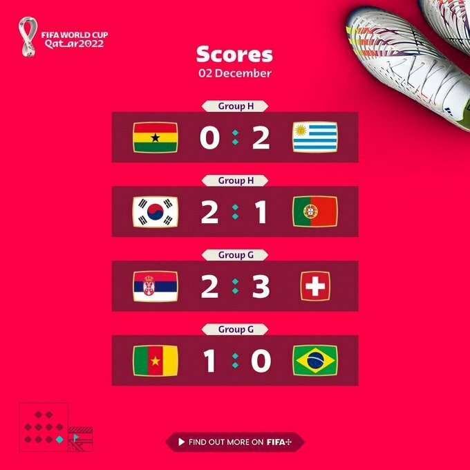 В 1/8 финала Бразилия сыграет против Южной Кореи (5 декабря в 21:00), а Португалия будет сражаться со Швейцарией (6 декабря в 21:00).
