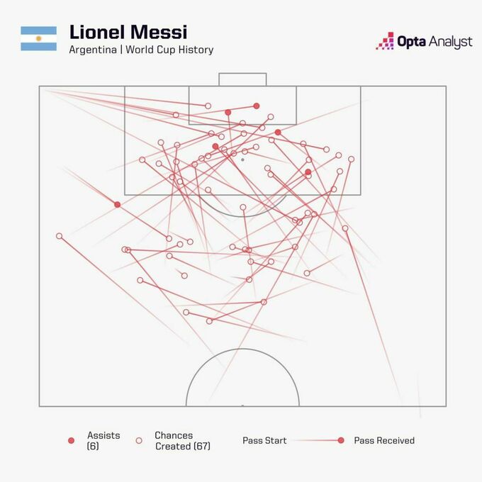 Лионель Месси повторил рекорд чемпионатов мира. Форвард сборной Аргентины сделал на пяти чемпионатах мира 67 передач под удар.