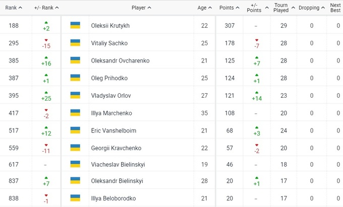 Украинцы в последнюю неделю особых успехов не достигли, но Алексею Крутых это не помешало немного обновить личное достижение, поднявшись на 2 позиции. Также новый рекорд установил Александр Овчаренко.