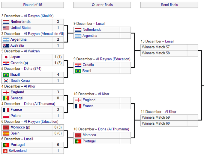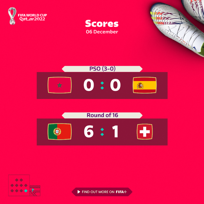6 декабря сборная Марокко обыграла команду Испании по пенальти (0:0, пен. 3:0), а Португалия разгромила Швейцарию (6:1).