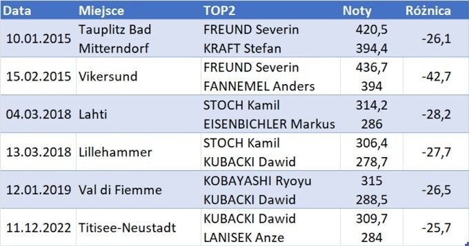 Со времен, когда в Кубке мира по прыжкам с трамплина были введены компенсации на ветер и ворота (2010 год) лишь в шестой раз в истории преимущество победителя над вторым местом составило более 25 баллов: