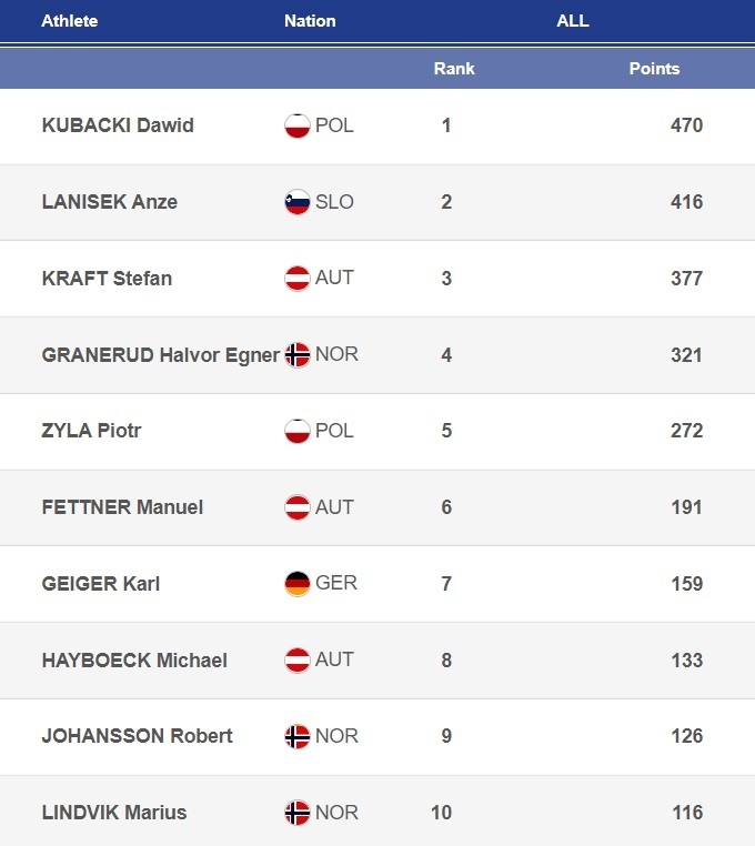 Увидеть Кубацки снова в такой огненной форме, конечно, мало кто ожидал, однако имеем то, что имеем. Впрочем, несмотря на ударный старт сезона, уйти в отрыв в общем зачете Кубка мира Давид не сумел: Ланишек не выглядел в Нойштадте настолько же мощно, как поляк, но сумел увезти из Германии ровно те же 180 очков, и в генеральной классификации проигрывает лидеру всего 54 балла. Впрочем, не покидает ощущение, что оба по ходу сезона отступят на вторые роли: Кубацки после ударного лета и старта зимнего сезона спад таки должен настигнуть, а у Ланишека начиная с января проседание формы идет всегда. Однако пока что оба на коне: 26-летний словенец в пятницу одержал свою третью в карьере победу на Кубке мира, и впервые победил за пределами финской Руки.