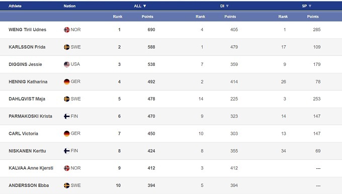 Лидер Кубка мира Тириль Венг продолжает собирать высокие, но не победные места: четвертая в спринте и седьмая в разделке. Джессика Диггинс, которая сейчас выглядит главной соперницей Венг в общем зачете, выступила в Бейтостолене достойно, учитывая, что обе личных гонки были ее нелюбимым стилем передвижения, классикой: вылет в четвертьфинале спринта (17-е место в итоге) и шестой результат в разделке. После пропуска этапа в Лиллехаммере из-за болезни вернулась в Кубок мира и ее партнерша по сборной США Рози Бреннан. В спринте она также вылетела в четвертьфинале, а в разделке стала восьмой.