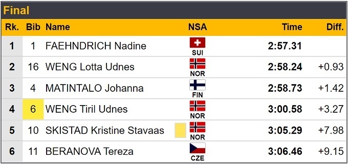 У женщин победу одержала швейцарка Надин Фэндрих. Компанию на подиуме ей составили норвежка Лотта Венг и финка Йоханна Матинтало. Лидер Кубка мира Тириль Венг финишировала четвертой.