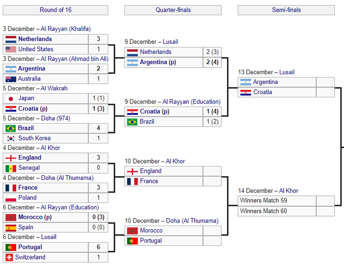 Таким образом, 13 декабря в 21:00 в полуфинале между собой сыграют Аргентина и Хорватия. Вторая полуфинальная пара будет определена 10 декабря.