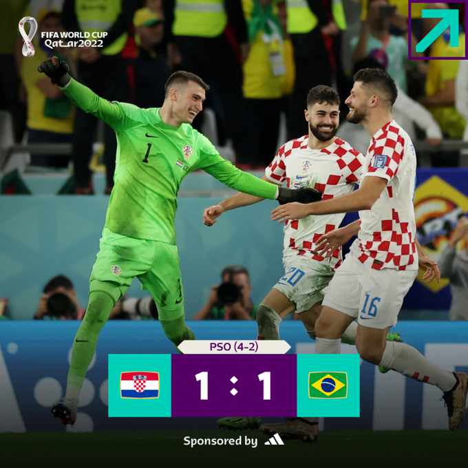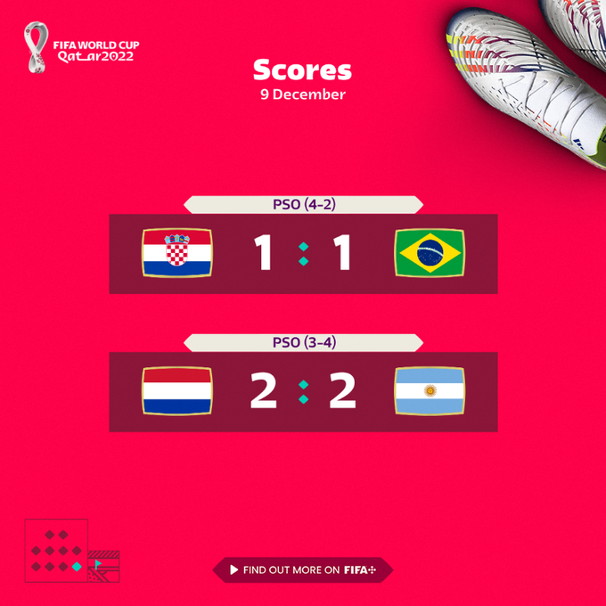 Сборная Хорватии сенсационно обыграла по пенальти команду Бразилии (1:1, пен. 4:2), а Аргентина тоже в серии послематчевых 11-метровых ударов нанесла поражение Нидерландам (2:2, пен. 4:3).