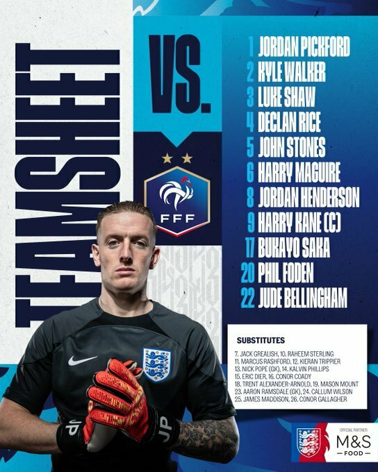 Англия: Пикфорд, Уокер, Магуайр, Стоунз, Шоу, Райс, Беллингхэм, Хендерсон, Сака, Фоден, Кейн