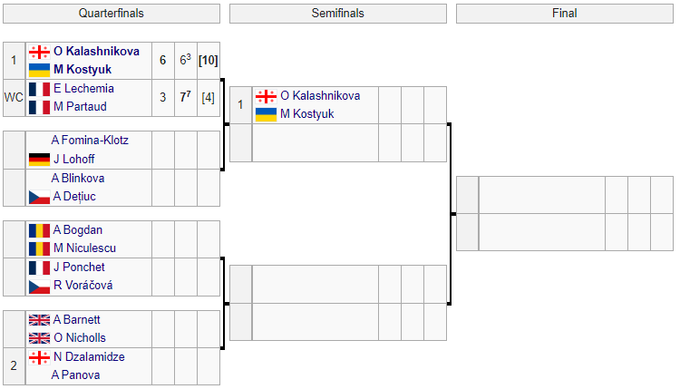 Марта Костюк (Украина) / Оксана Калашникова (Грузия) [1] – Эликсан Лешемья / Марин Парто (Франция) [WC] – 6:3, 6:7 (3:7), [10–4]