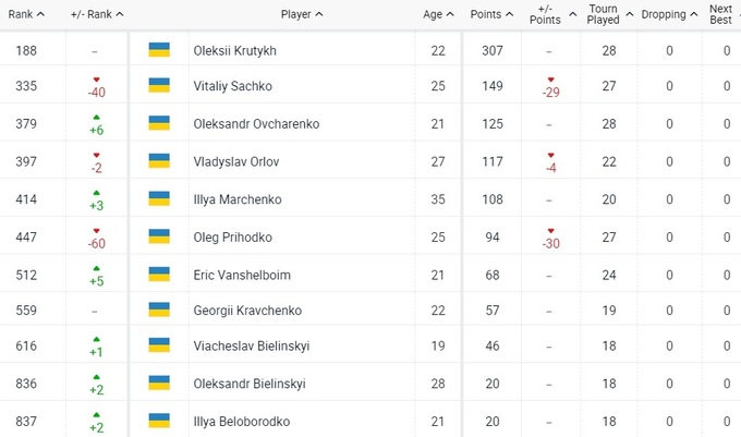 Лидер украинского тенниса Алексей Крутых сохранил 188 место. Виталий Сачко потерял очки за прошлогодний полуфинал челленджера в Форли и опустился на 40 позиций. С Олега Приходько списали очки за прошлогодний финал челленджера в турецкой Анталье, он опустился на 60 строчек. Илья Марченко и Александр Овчаренко немного улучшили свои позиции, Саша в очередной раз обновил личный рекорд.