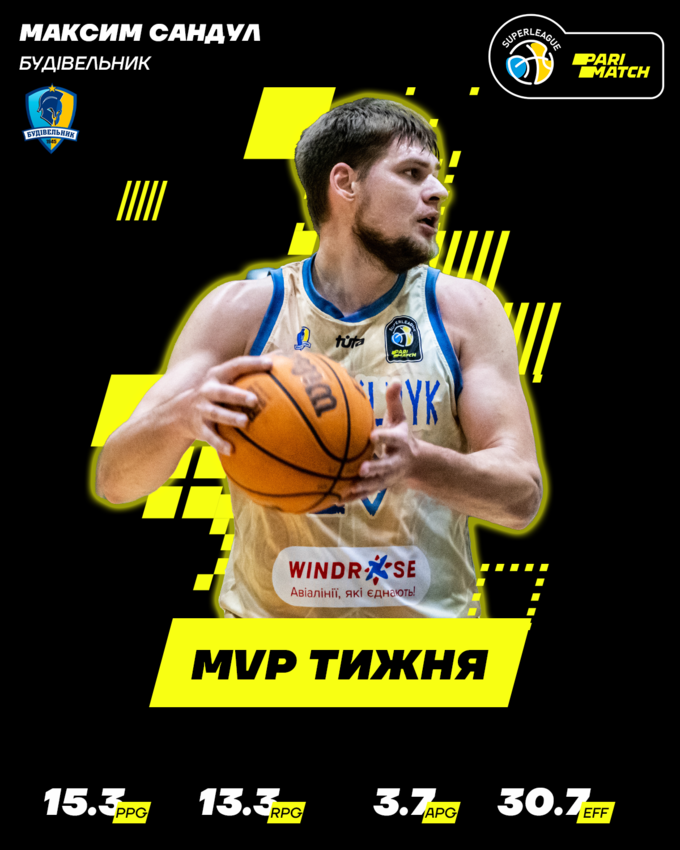Центровой киевского клуба «Будивельник» Максим Сандул признан MVP прошедшей недели в баскетбольной Суперлиге Украины.