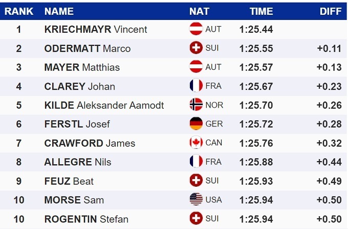Австрийский горнолыжник Винсент Крихмайр выиграл первый скоростной спуск на этапе Кубка мира в итальянской Валь Гардене. Он опередил лидера общего зачета Кубка мира Марко Одерматта и своего партнера по команде Маттиаса Майера.