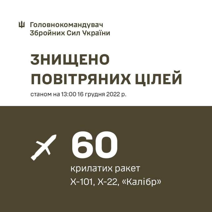 16 декабря российские оккупанты устроили очередной массированный обстрел украинской критической инфраструктуры. Главнокомандующий Валерий Залужный заявил, что было выпущено 76 ракет.