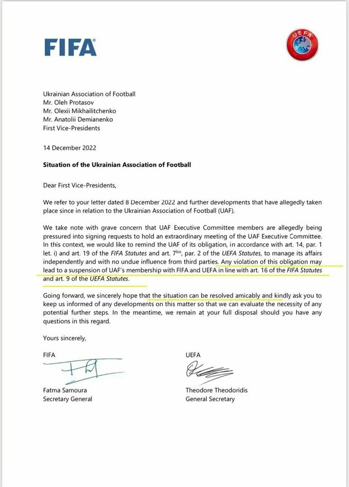 «ФИФА и УЕФА в адресном письме вице-президентам УАФ напоминает, что украинская ассоциация должна осуществлять управление своими делами без влияния третьих сторон. Любое нарушение этого обязательства может привести к приостановлению членства УАФ в ФИФА и УЕФА в соответствии со ст. 16 Устава ФИФА и ст. 9 Устава УЕФА».