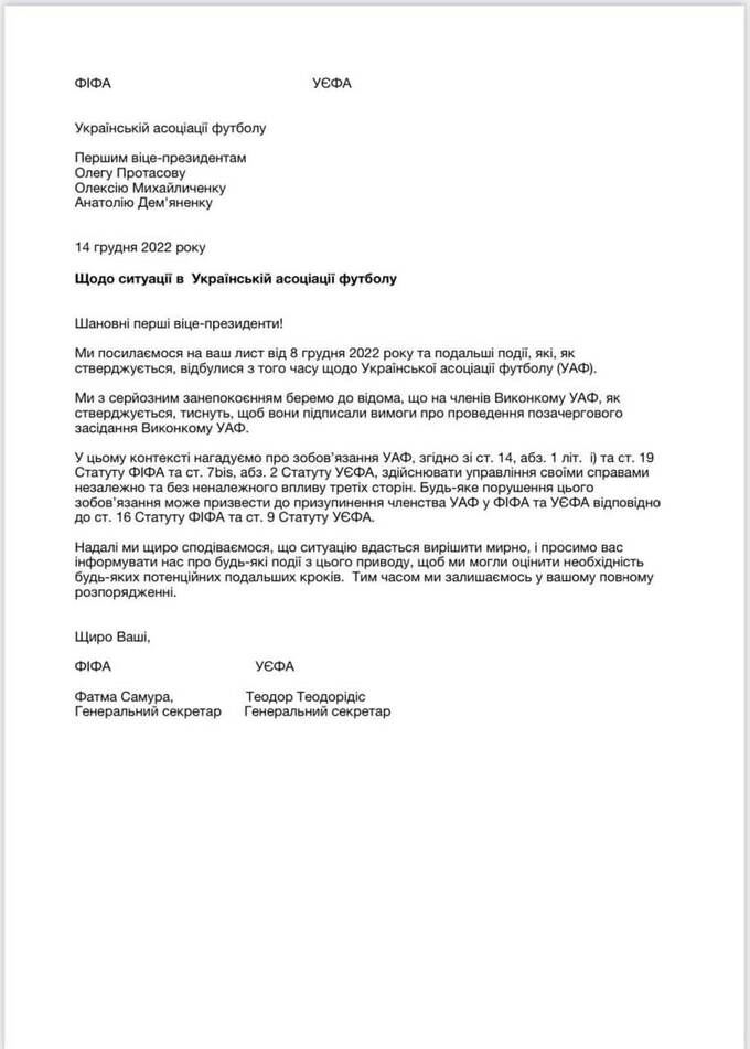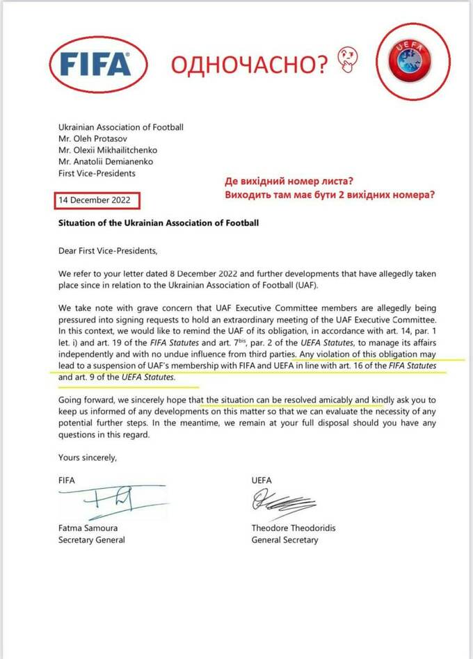 «На ФБ 1-го вице-президента УАФ Олега Протасова – письмо сразу от ДВУХ футбольных организаций – ФИФА и УЕФА.