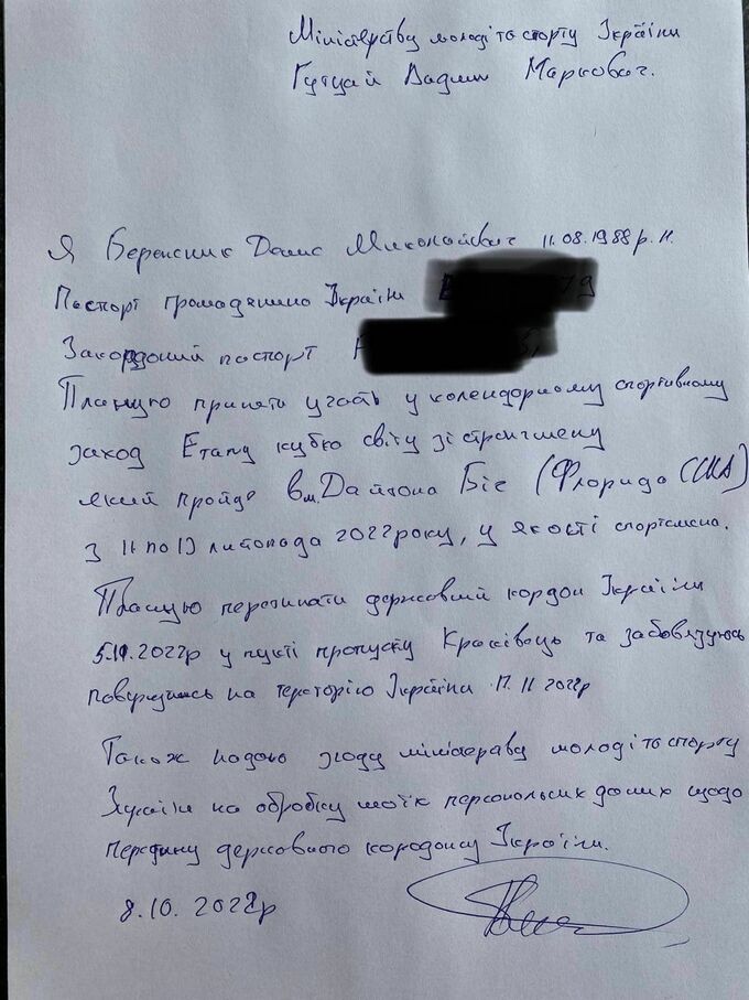Еще 5 ноября этого года Бережник улетел в США для участия в календарных международных соревнованиях. Вернуться в Украину он должен был до 17 ноября, однако этого не сделал, оставшись на территории Штатов.