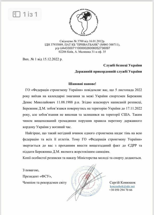 ФСУ обратилась в Службу безопасности (СБУ) и Государственную пограничную службу Украины для реагирования и наказания Дениса Бережника.