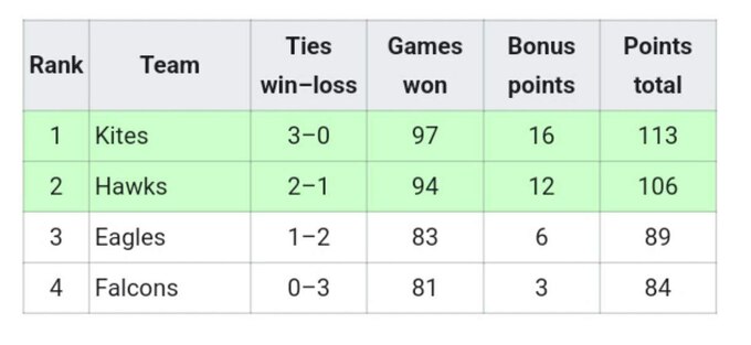 - «Kites»: 97 выигранных геймов + 16 бонусов = 113 очков