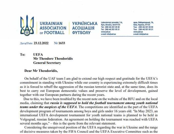 Украинская ассоциация футбола сделала запрос в Европейский футбольный союз за разъяснениями что до вероятного проведения на территории рф, которая является страной-агрессором, международного турнира, о чем сообщил тамошний футбольный союз и различные местные СМИ. Из киевского Дома футбола в Ньон ушло письмо, адресованное генеральному секретарю УЕФА Теодору Теодоридису.