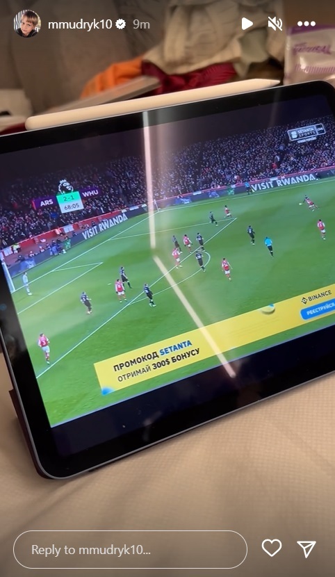 Вингер донецкого «Шахтера» Михаил Мудрик выложил у себя в Инстаграме сториз, на котором видно, что он смотрит матч 17-го тура АПЛ «Арсенал» - «Вест Хэм».