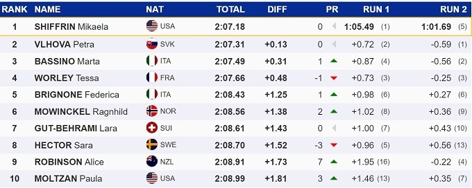 Второй с отставанием в 0,13 секунды стала словачка Петра Влхова, которая отыграла большую часть из своего отставания в 0,72 секунды после первой попытки. Топ-3 замкнула итальянка Марта Бассино.