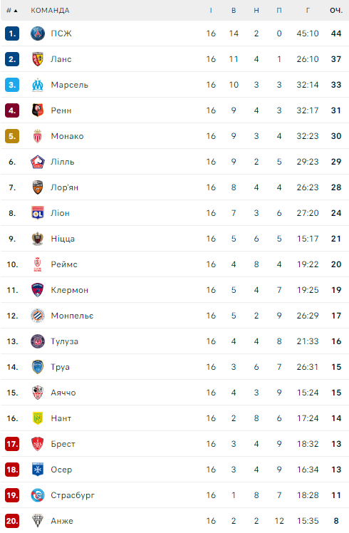Лидеры Лиги 1: ПСЖ (44 очка), Ланс (37), Марсель (33), Ренн (31), Монако (30), Лилль (29), Лорьян (28).