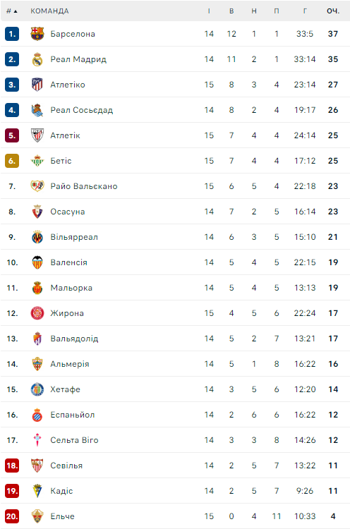 Лидеры Ла Лиги: Барселона (37), Реал (35), Атлетико (27), Реал Сосьедад (26), Атлетик (25), Бетис (25).