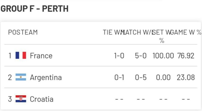 В группе F в первом туре сыграли сборные Франции и Аргентины. Французы отомстили аргентинцам за финал ЧМ-2022 по футболу и «вынесли» их с корта. Как итог – счет 5:0. Третья команда в группе F – Хорватия.