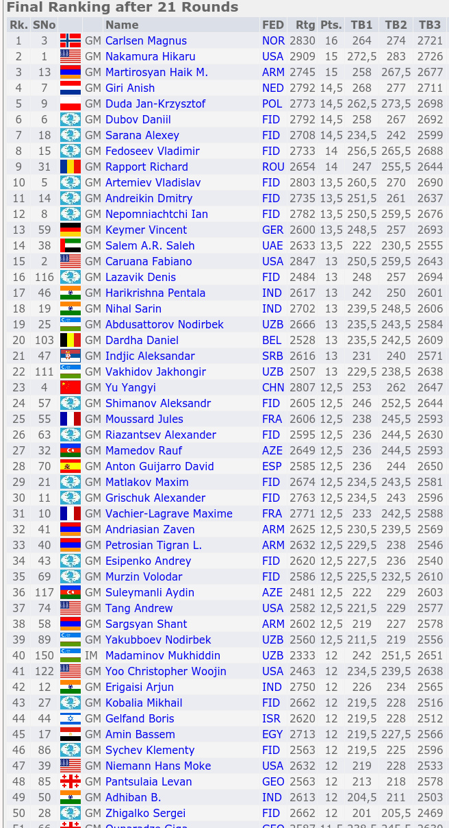Второе место занял Хикару Накамура из США, третье – у Айка Мартиросяна из Армении (по 15 очков). Единственный украинский участник Александр Моисеенко набрал 9 очков и занял 130-е место среди 176 участников.