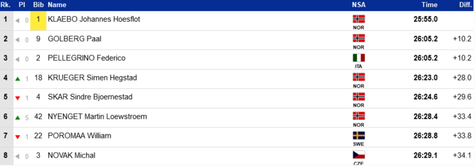Он опередил партнера по команде Пола Гулберга и итальянца Федерико Пеллегрино. Вчера Клэбо выиграл и спринт свободным стилем в Валь Мюстере.