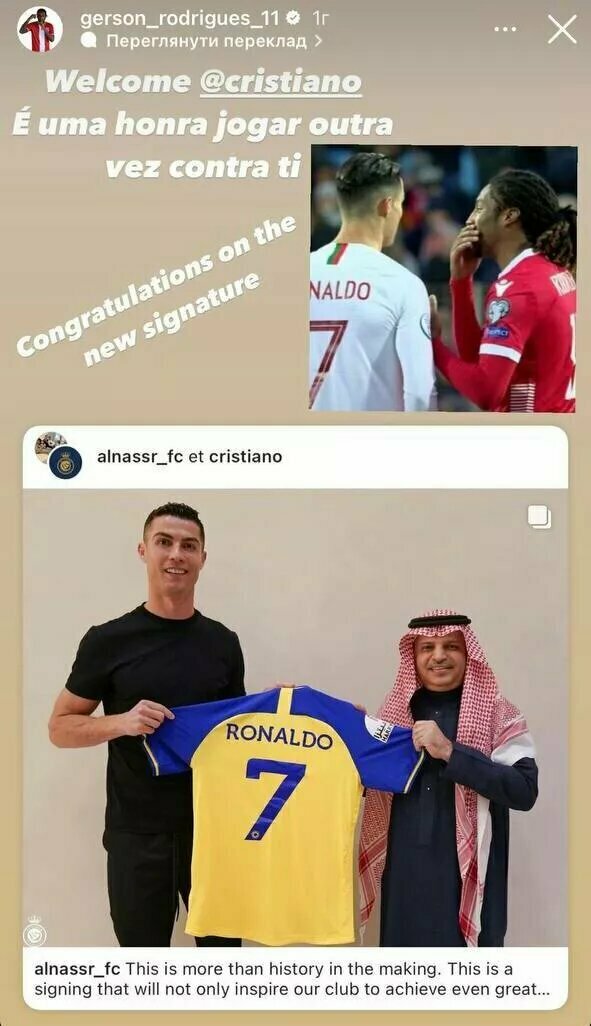 Форвард киевского «Динамо» Жерсон Родригеш, который сейчас выступает на правах аренды за аравийский клуб «Аль-Вахда», поздравил в своем Instagram звездного португальского нападающего Криштиану Роналду с подписанием контракта с ФК «Аль-Наср»: