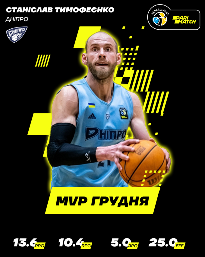 Лучшим стал капитан «Днепра» Станислав Тимофеенко. В декабре он в среднем набирал 13,6 очка, 10,4 подбора, 5,0 передачи и 1,4 перехвата, реализуя 71% двухочковых бросков. Его средний рейтинг эффективности составил 25,0 балла.
