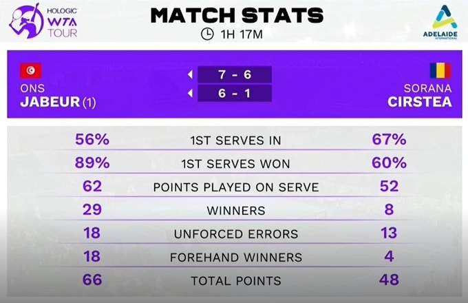 Вторая ракетка мира Онс Жабер из Туниса выиграла матч второго раунда на турнире WTA 500 в Аделаиде и в 1/4 финала сразится против украинки Марты Костюк (№69 WTA).
